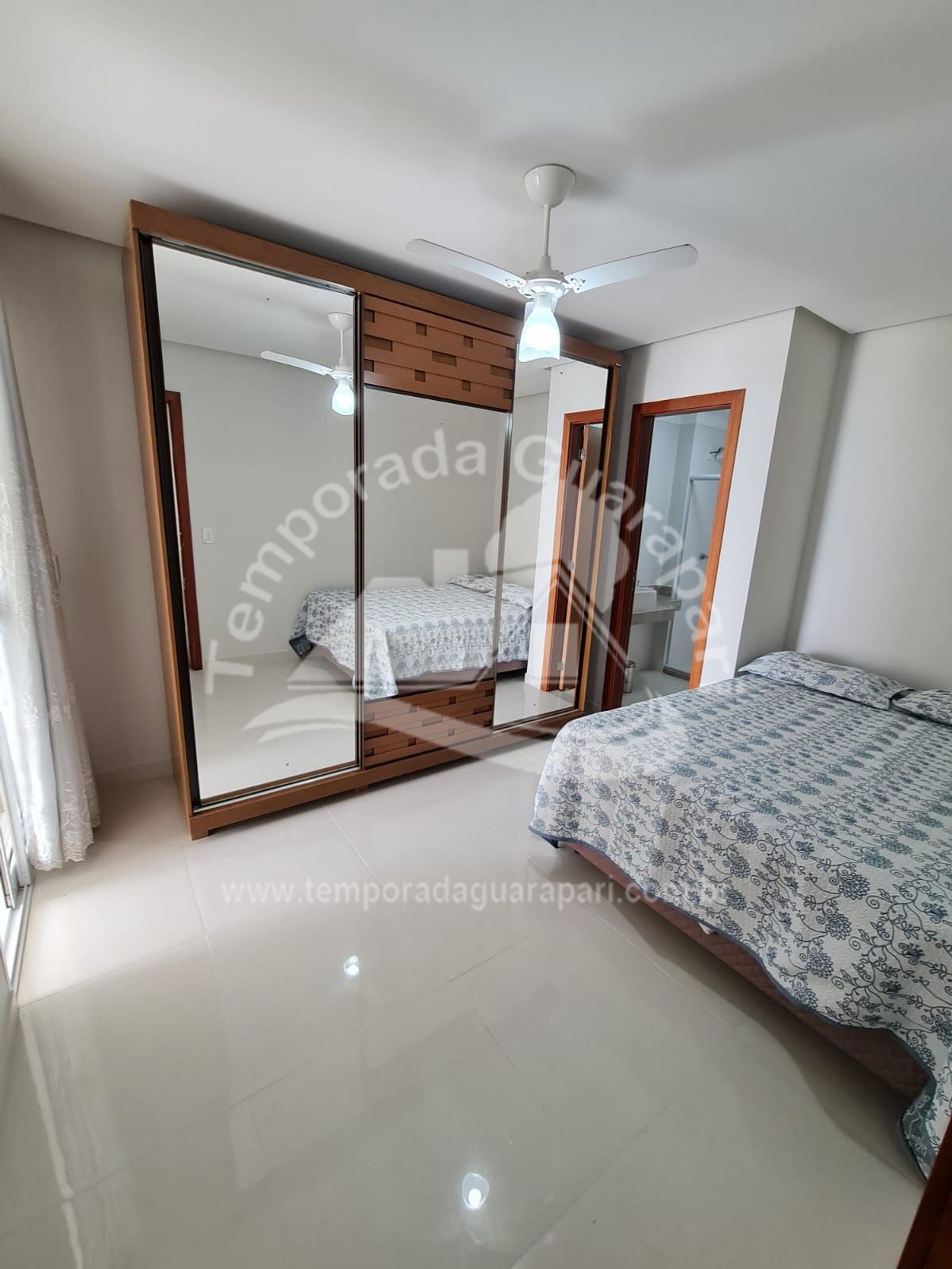 = 1 ar condicionado na suíte e ventiladores de teto nos demais quartos .
