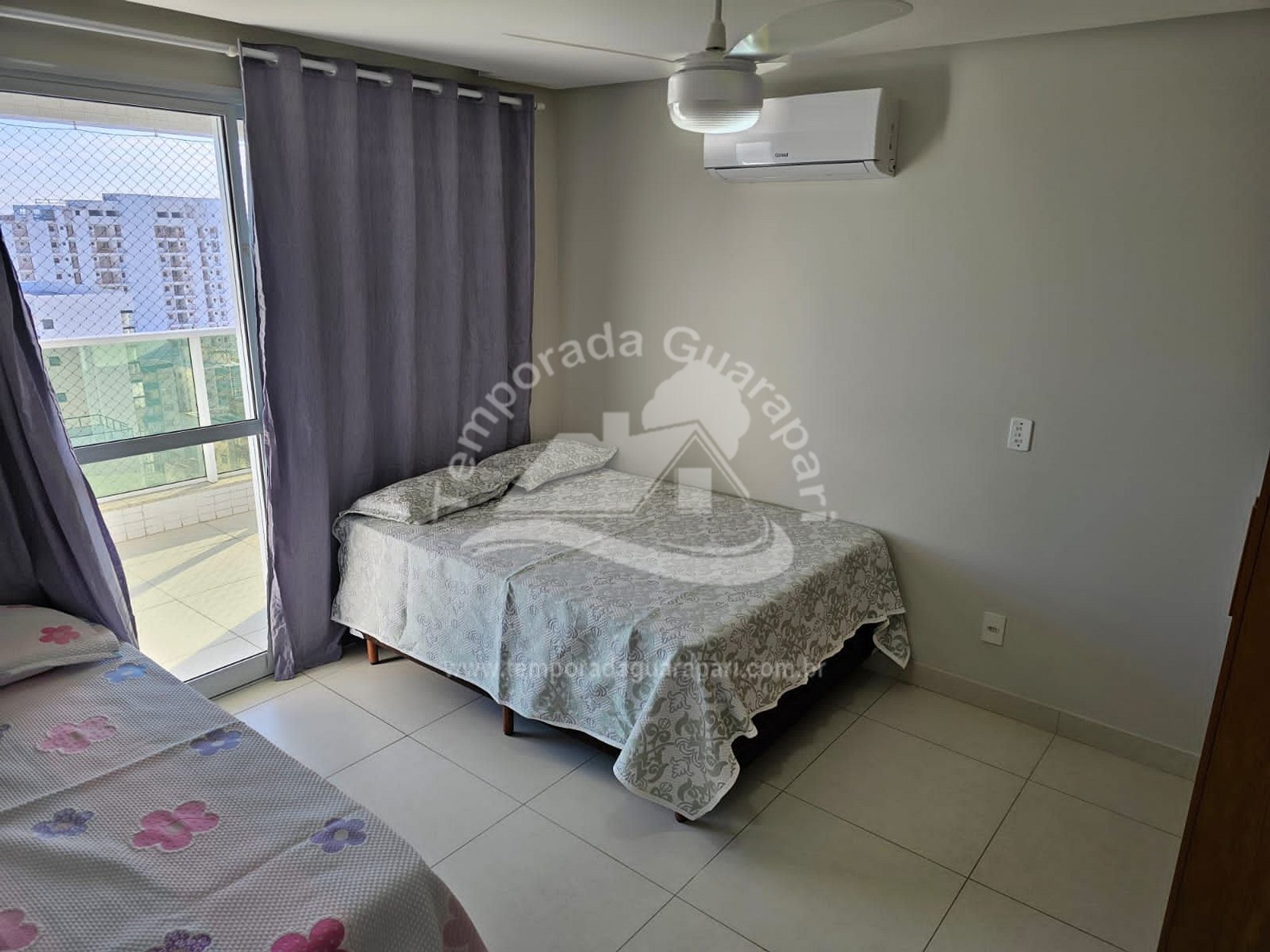 = 2 quartos com ar condicionado e ventilador de teto no outro quarto .